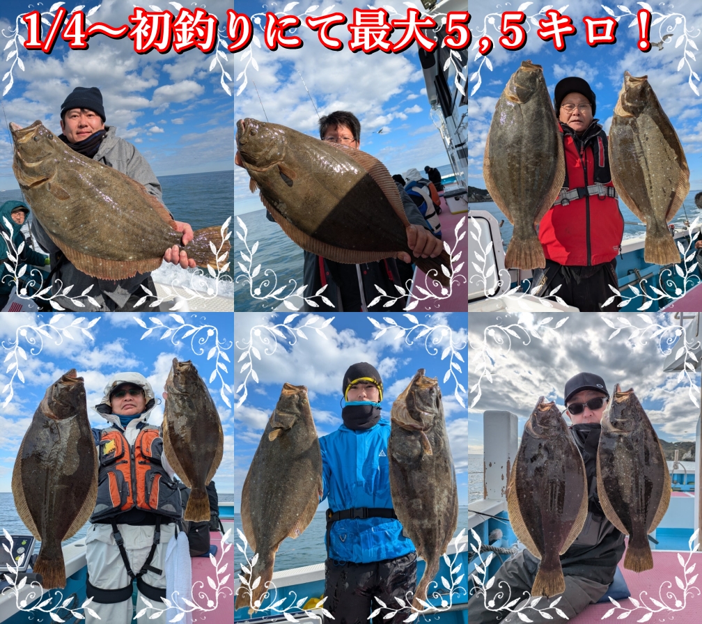 1月~も、午前ヒラメで出船します。昨年末よりイワシの回遊と共に大型のヒラメも釣れ始め、これから冬にかけて最盛期をむかえ、魚も肉厚となって脂ものりはじめて来ます!現在は5m~10mの浅場を狙っていますので、大型のヒラメのアタリや引きは強烈で、初心者の方にても楽しめると思います。ライトタックルのレンタルもありますので、是非、挑戦してください!